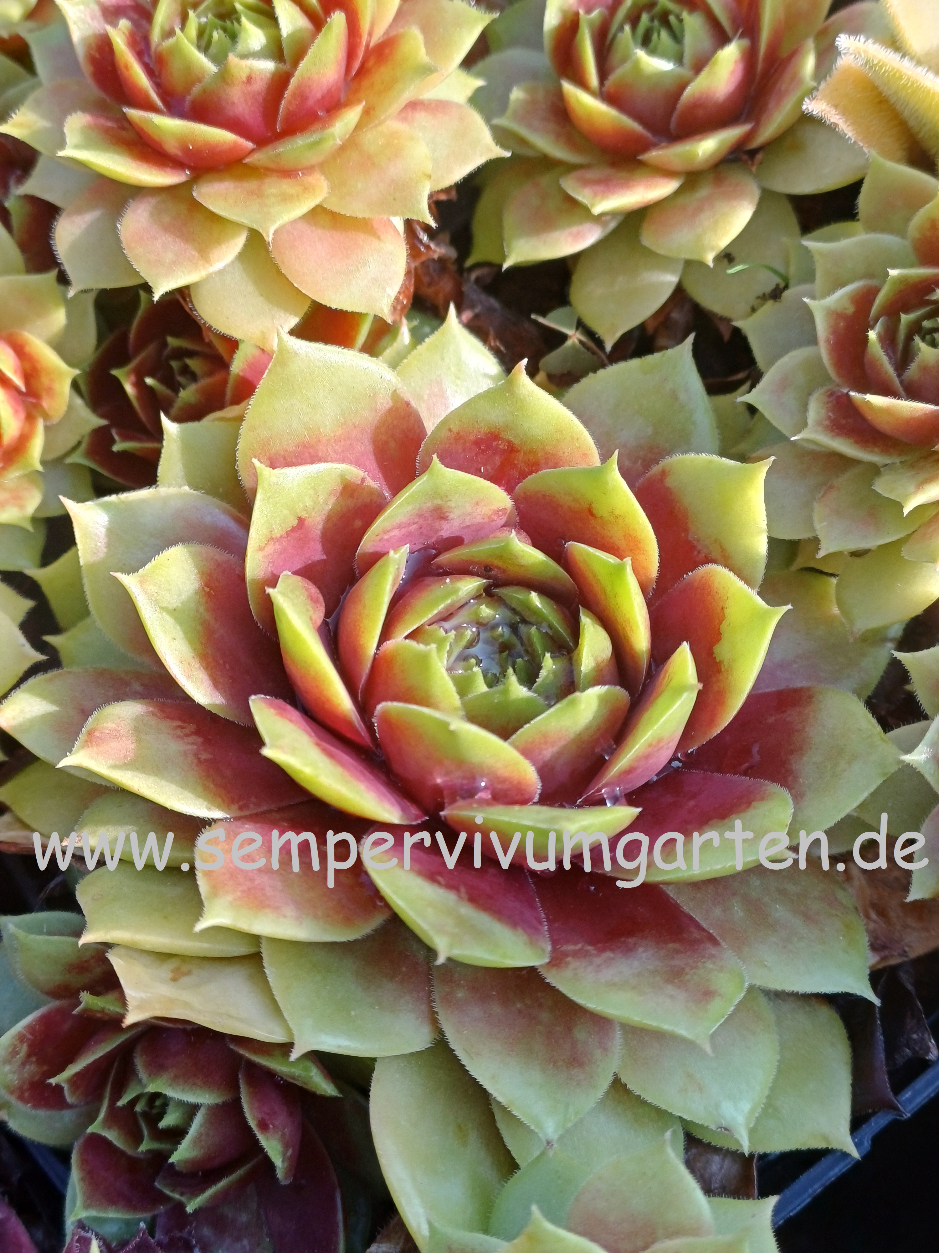 Sempervivum Sonnenherz ist eine neuere Züchtung mit schöner Färbung. Die mittelgroßen, offenen Rosetten sprossen willig.